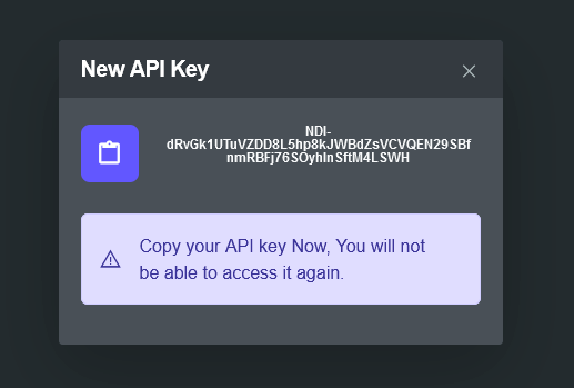 After selecting Create, you will be prompted with another dialog to copy the generated API key. You will not be able to retrieve this API key again, so save it somewhere before dismissing the dialog. For information on how to use the API key in a request, see the API section of this document.