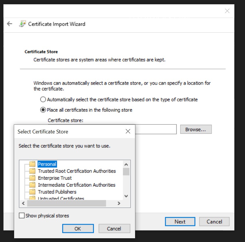 When prompted to select a certificate store, either use the automatic option, or manually select the personal certificate store.