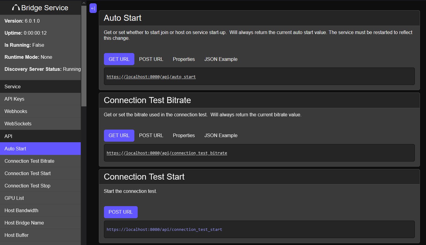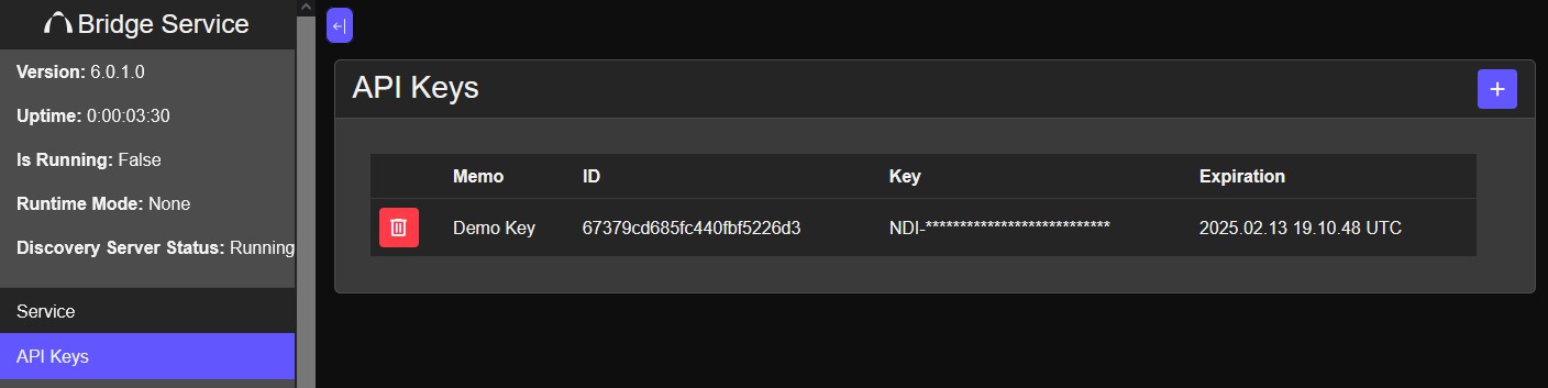 The NDI Bridge Service web page provides an API reference, runtime status information, webhook management, WebSocket management, and API key management if SSL is enabled.