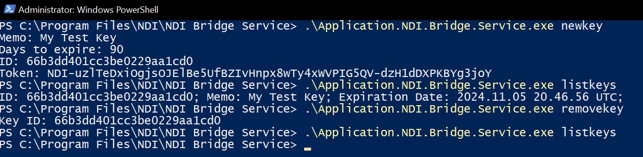 sue and invalidate API keys. Navigate to the install directory and locate Application.NDI.Bridge.Service.exe. This application takes the following command line arguments to manage API keys.