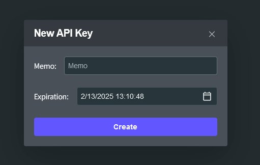 To add an API key, click on the add button in the upper right-hand corner of the API Keys section on the page. You will be presented with a dialog where you can add a memo to help distinguish the purpose of this API key and set an expiration date.