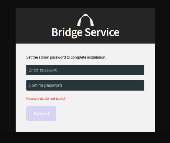 Once the installation is finished, the service will be started. If the Enable Web Content field was checked on the configuration page, your browser will open to the NDI Bridge Service web page. Additionally, if you enabled SSL, you will be required to set up a password for the ’admin’ account upon navigating to the web page. The password must contain upper and lowercase letters, numbers, and symbols.