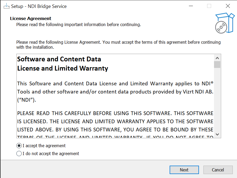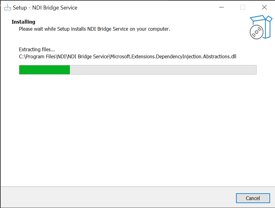 NDI Bridge Service uses a standard installation wizard. Follow the prompts to install and configure NDI Bridge Service.