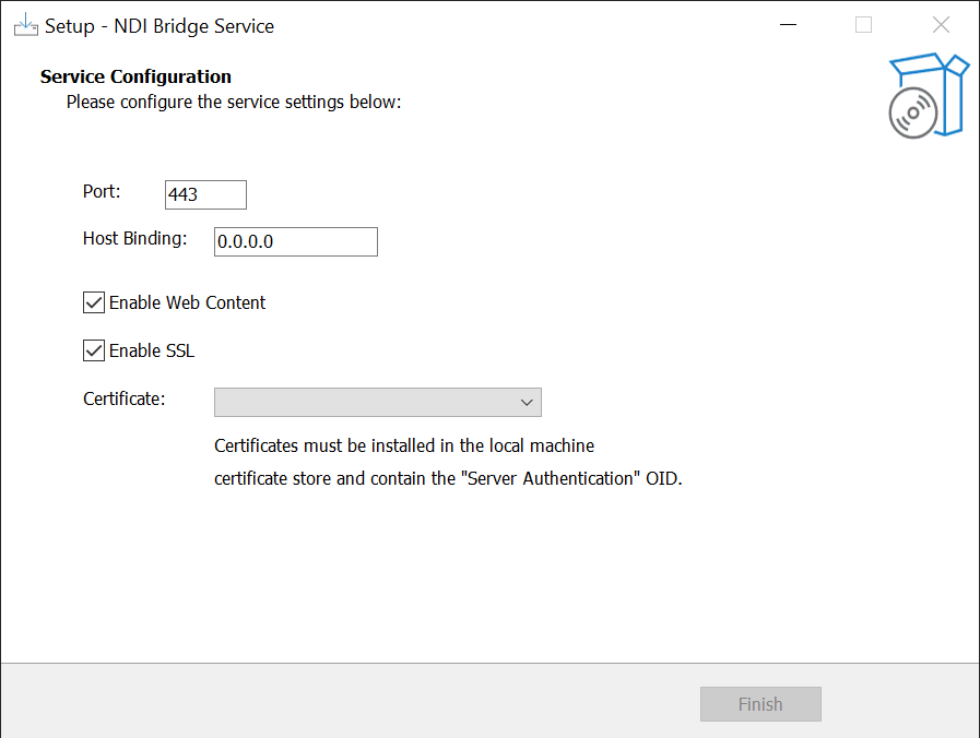 Certificate: If SSL is enabled, you must select a valid certificate from the drop-down menu. SSL certificates must be installed in the local machine certificate store under the logical store path ’Personal/Certificates’, as this is the only location where NDI Bridge Service looks for your certificate with a matching CN subject. Your certificate should be visible from the drop- down menu if you did this before running the installer. If you need to modify this or any other setting after installation, you can do so manually by following the instructions in the Configuration section of this document.