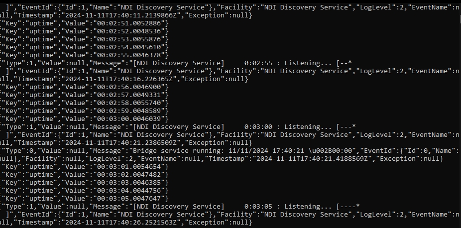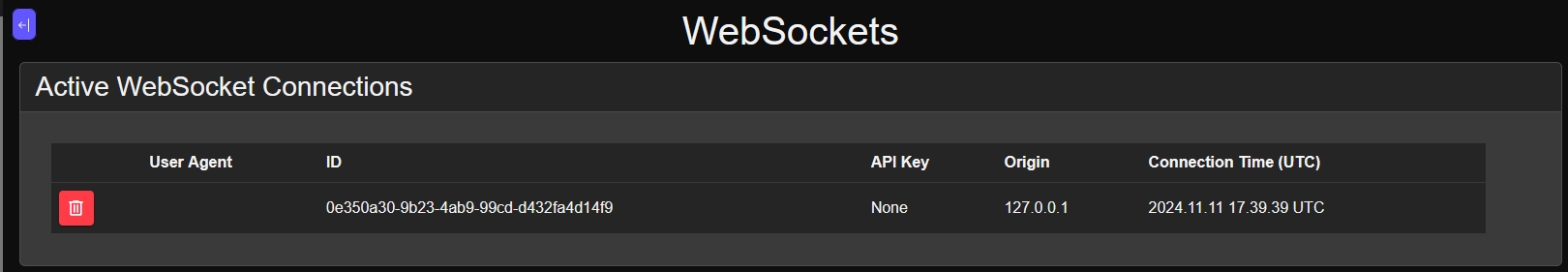 Bridge Service supports WebSocket connections for listening to changes in any property. Logs are also sent over WebSocket connections. Data transmitted through the WebSocket connection is in JSON format. Active WebSocket connections can be viewed under the WebSockets section of the web interface. The WebSocket is listening on endpoint /stream