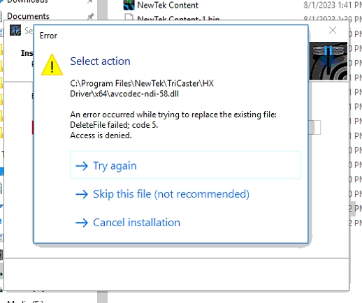 Sometimes when installing NDI Tools you will be presented with an error message about stopping a particular service or process. This is could be because one of the NDI Tools is running in the or a program that uses NDI, either as an input or output (such as OBS, Adobe, Teams, etc), is currently running in the background. Please shut down any program and ensure that they're shut down from the Notification area and the Task Manager, then run the installer again. Check for this potential error: