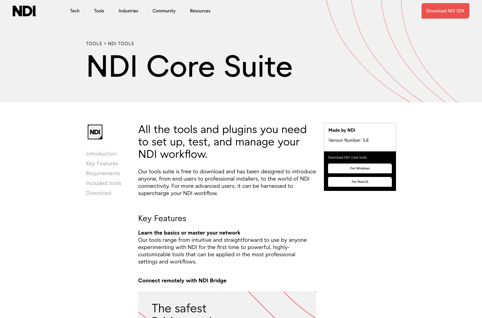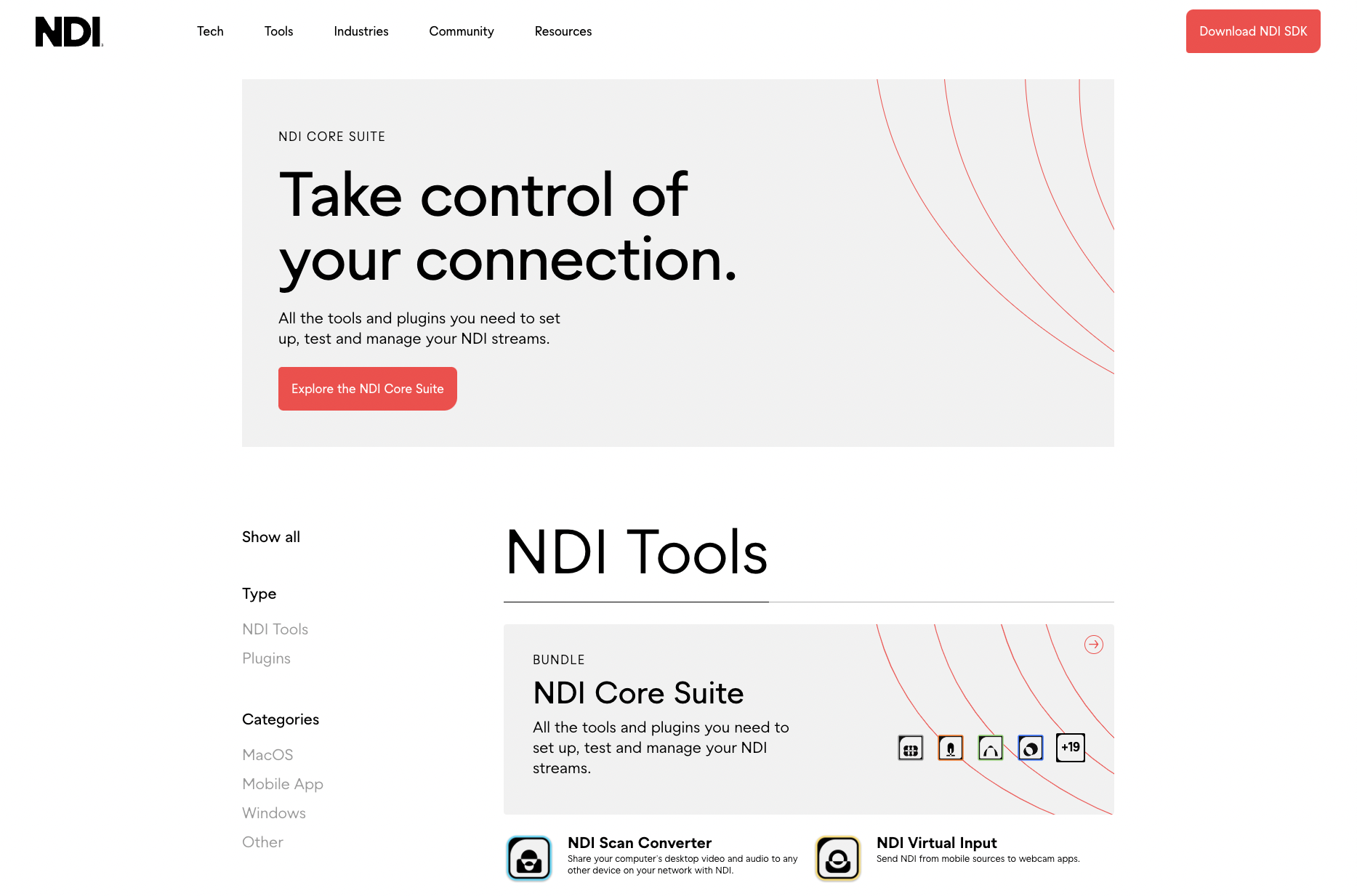 By clicking the **"Download NDI Tools"** button, you'll enter the [NDI Tools download](https://ndi.video/tools/download/) page. This includes all the NDI Tools and plugins you need to set up, test, and manage your NDI workflow. On this page, you'll be able to explore a list of all included tools in NDI Tools (both for the Windows and Mac versions) and understand the minimum requirements to install it on your computer.