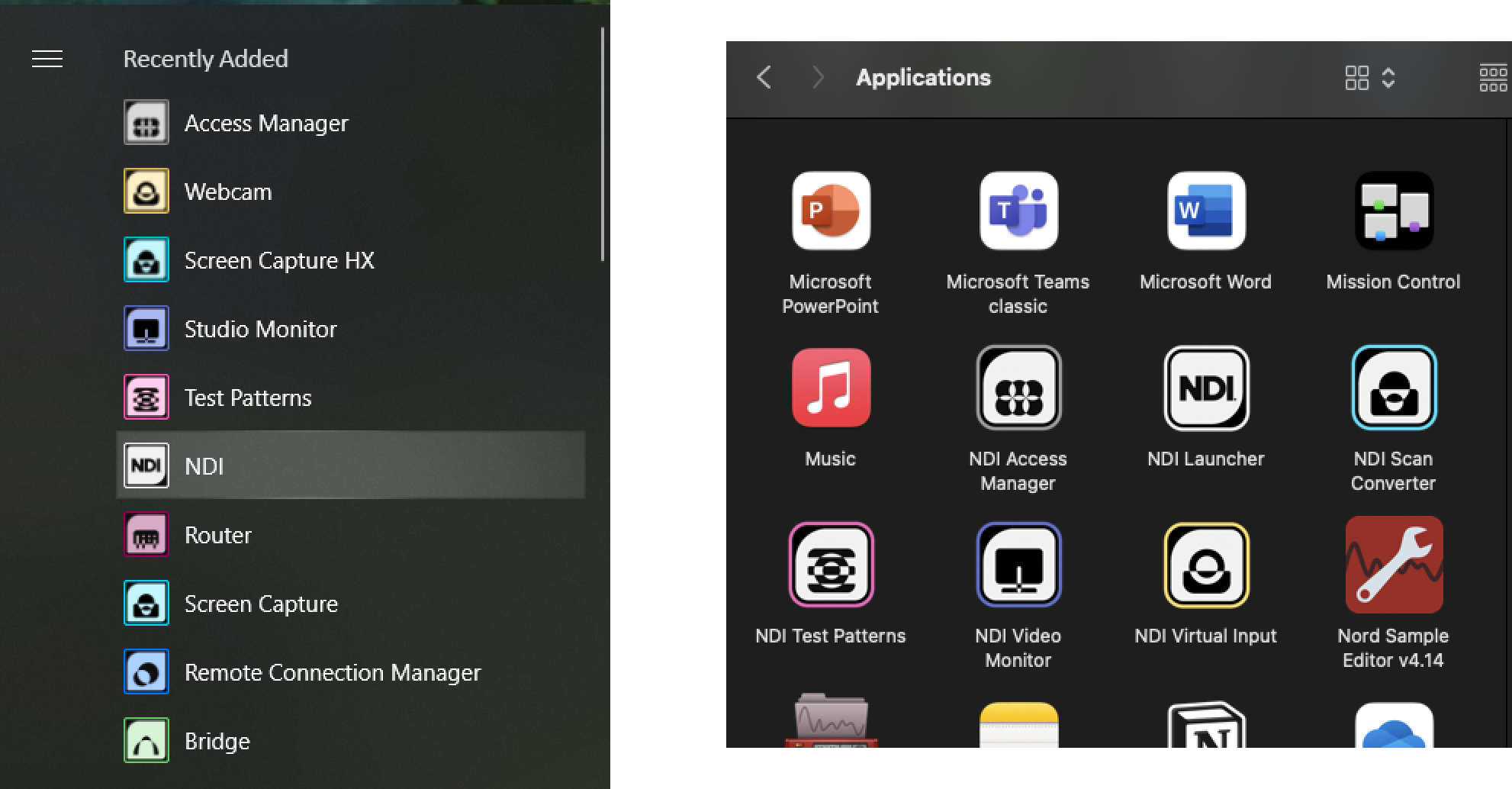 <figure><img src="https://content.gitbook.com/content/DO9LSaUxLOBIgPjyrjR1/blobs/MnHj2bKVxtBBN8FQNlwm/image.png" alt="" width="563"><figcaption><p>Screenshot of Windows Start Menu and Mac OS Applications folder containing some NDI Tools and the NDI Launcher.</p></figcaption></figure>