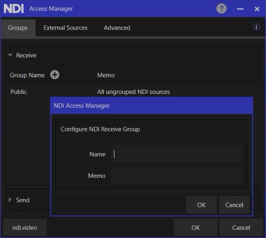 <figure><img src="https://content.gitbook.com/content/DO9LSaUxLOBIgPjyrjR1/blobs/HUPN3DeUpk266GVQ1VlD/Access%20Manager%201.jpeg" alt="" width="410"><figcaption><p>Creating a new NDI Receive Group</p></figcaption></figure>