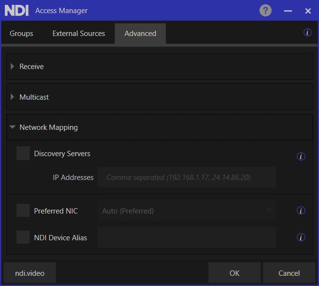 * Use the **External Sources** tab to reach NDI-enabled devices on subnets that are not on your current network.