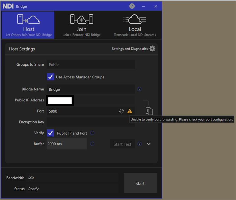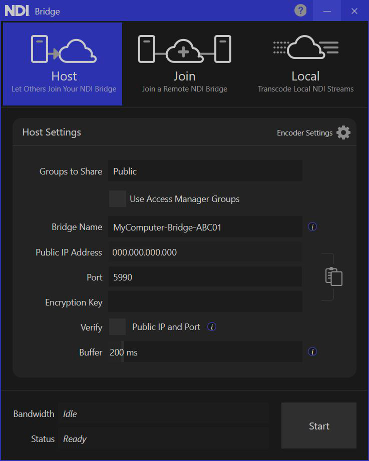 * **Server IP Address**: This field is automatically populated by default on Bridge startup; the application automatically discovers the public IP address of the wan connection. However, NDI Bridge Host/Join can be used inside a local area network or over an existing VPN; a local Bridge Join can connect to a local Host using the physical Host IP Address.