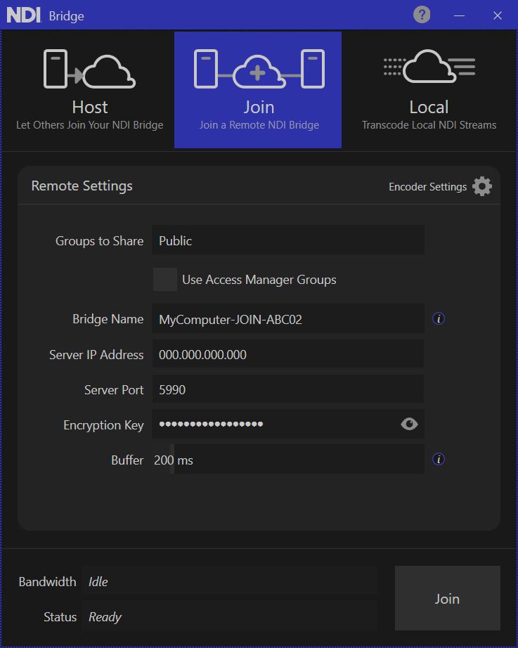 <figure><img src="https://content.gitbook.com/content/DO9LSaUxLOBIgPjyrjR1/blobs/4wUxCN80mlLyIEWENudJ/Bridge2.JPG" alt="" width="369"><figcaption><p>Screenshot of Join menu on NDI Bridge (Windows)</p></figcaption></figure>