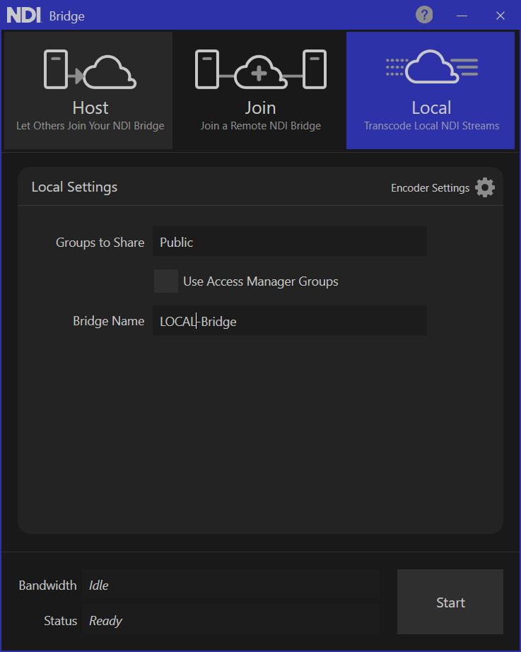4. Click **Start** to activate the NDI Bridge in Local mode.