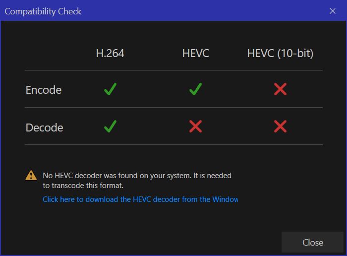 **Check Compatibility:** Verifies if the system can support h.264 and h.265 (HEVC) encoding and decoding.&#x20;