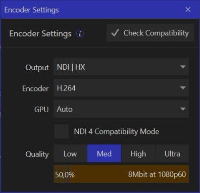 <figure><img src="https://content.gitbook.com/content/DO9LSaUxLOBIgPjyrjR1/blobs/oz0RbvsFywNEiHnzY9oe/encoder%20settings.jpeg" alt="" width="297"><figcaption><p>Screenshot of Encoder Settins menu on NDI Bridge (Windows)</p></figcaption></figure>