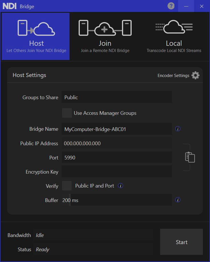 Server IP Address: This field is automatically populated by default on Bridge startup; the application automatically discovers the public IP address of the wan connection. However, NDI Bridge Host/Join can be used inside a local area network or over an existing VPN; a local Bridge Join can connect to a local Host using the physical Host IP Address.