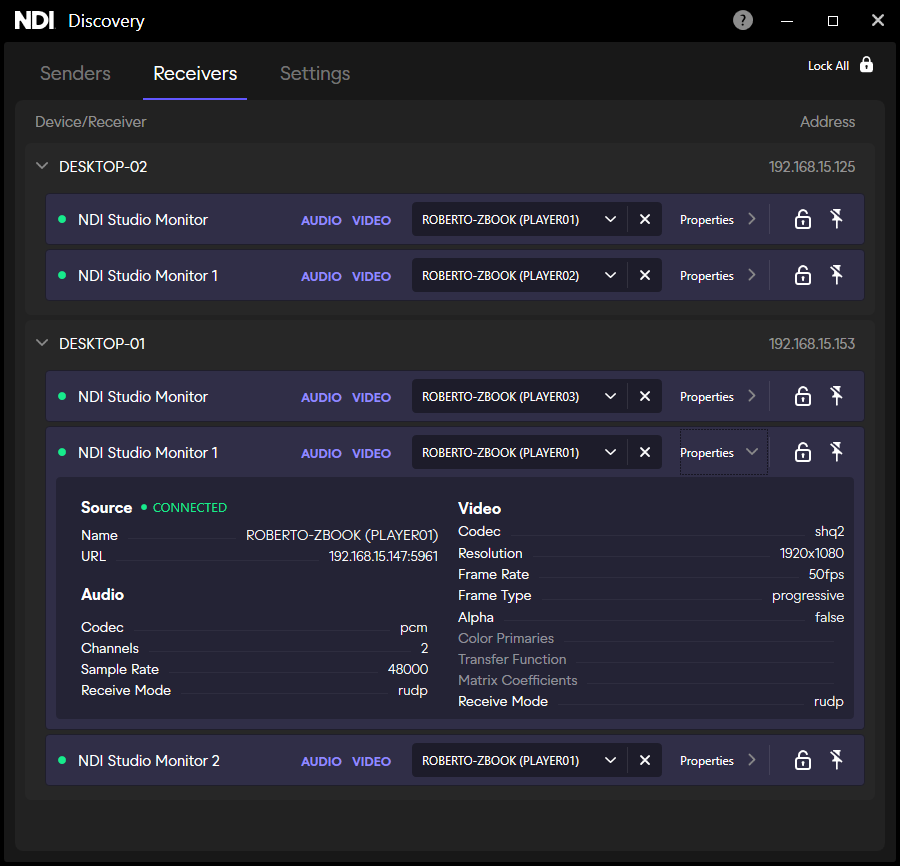 Shows all NDI receivers (endpoints listening for NDI streams) recognized by the Discovery Server. Devices are also grouped by hostname under receivers. This is especially useful when troubleshooting or confirming which machines are actively listening for NDI streams.