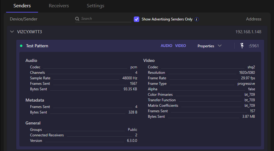As of **NDI 6.3**, this view also includes senders registered using the new NDI Sender Advertiser APIs. These APIs extend discovery support to senders, coexist with the legacy advertisement system, and enable improved visibility into sender properties and events when used with the Discovery Server.