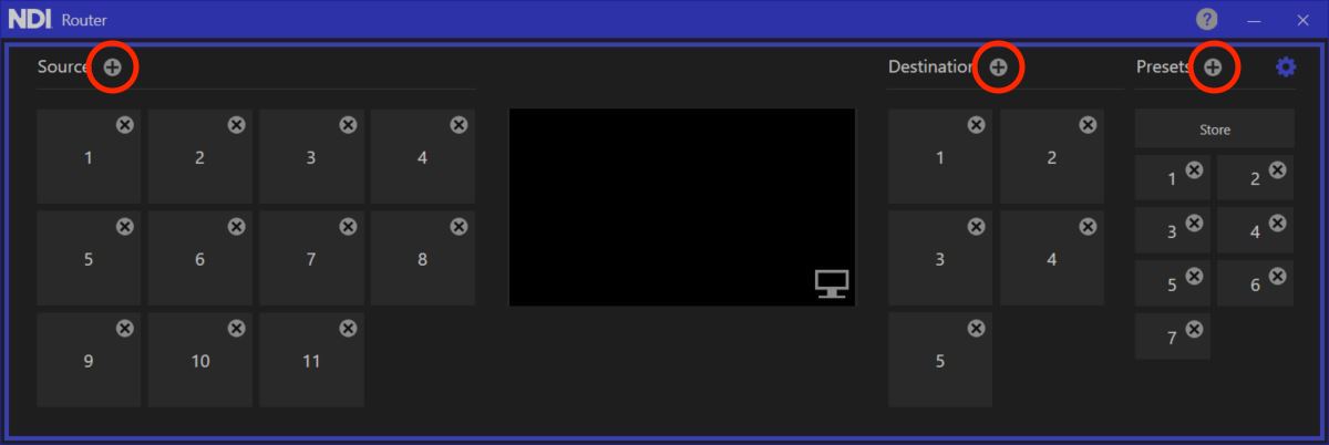 Once **configuration mode** is activated, sources, destinations, and preset buttons can be added by clicking on the icons highlighted below.