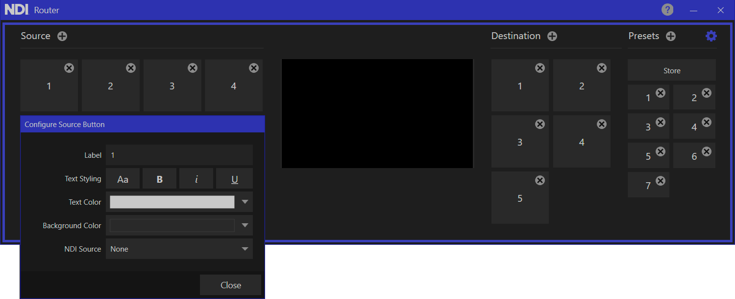 **Sources** can be managed and configured by **right-clicking** over a Source button. In this configuration panel, you can select the NDI sources that will be routed to the destination and define some extra settings like the button label, the text, and the background color.