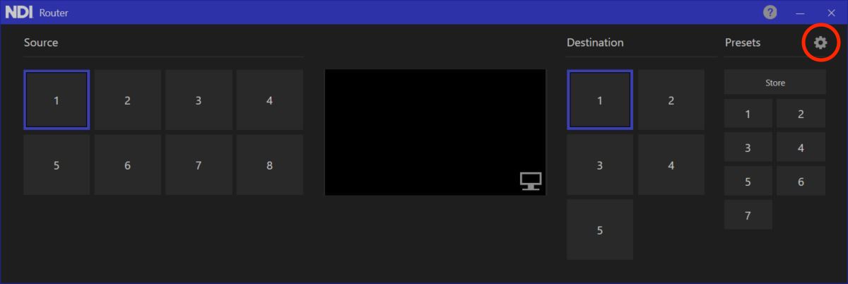 NDI Router can manage up to 64 sources and 64 destinations. To configure it, click on the gear icon in the upper right corner of the application to activate **configuration mode**.