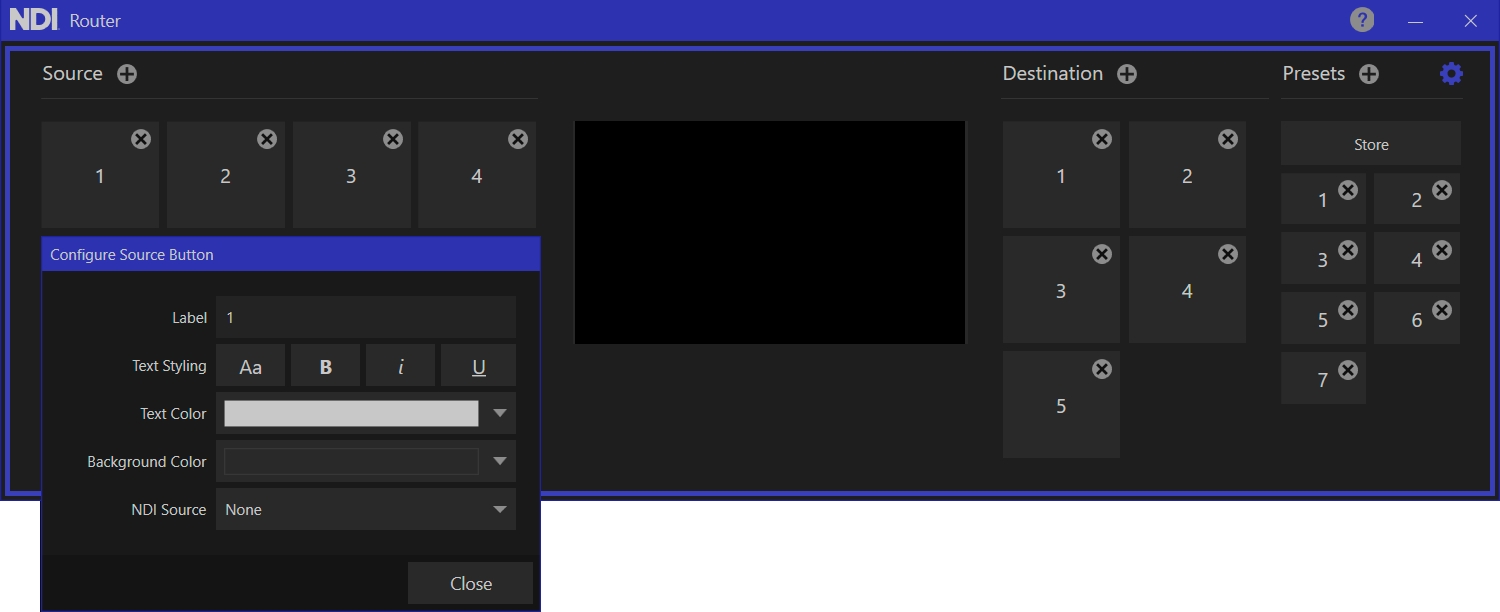 Sources can be managed and configured by right-clicking over a Source button. In this configuration panel, you can select the NDI sources that will be routed to the destination and define some extra settings like the button label, the text, and the background color.
