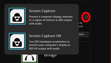 In the [NDI Launcher](https://docs.ndi.video/all/using-ndi/ndi-tools/ndi-tools-launcher), select the configuration gear to choose between two distinct versions of NDI Screen Capture. Select Screen Capture HX.